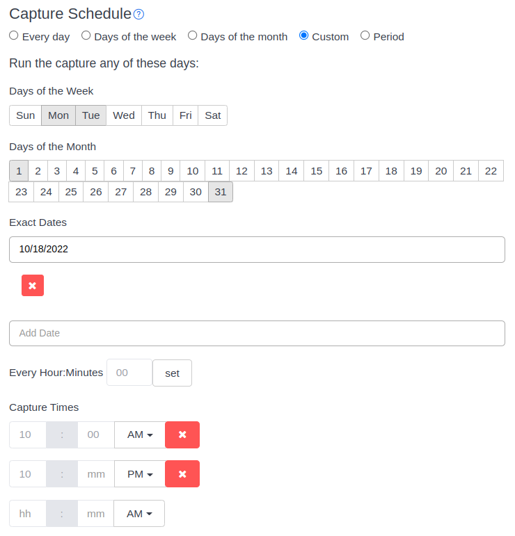 For this screenshot, the capture will run every Monday and Tuesday, and on the 1st and 31st of the month, and on October 18th, 2022 at both 10:00 AM and 10:00 PM. This level of customization should fit almost any use case.